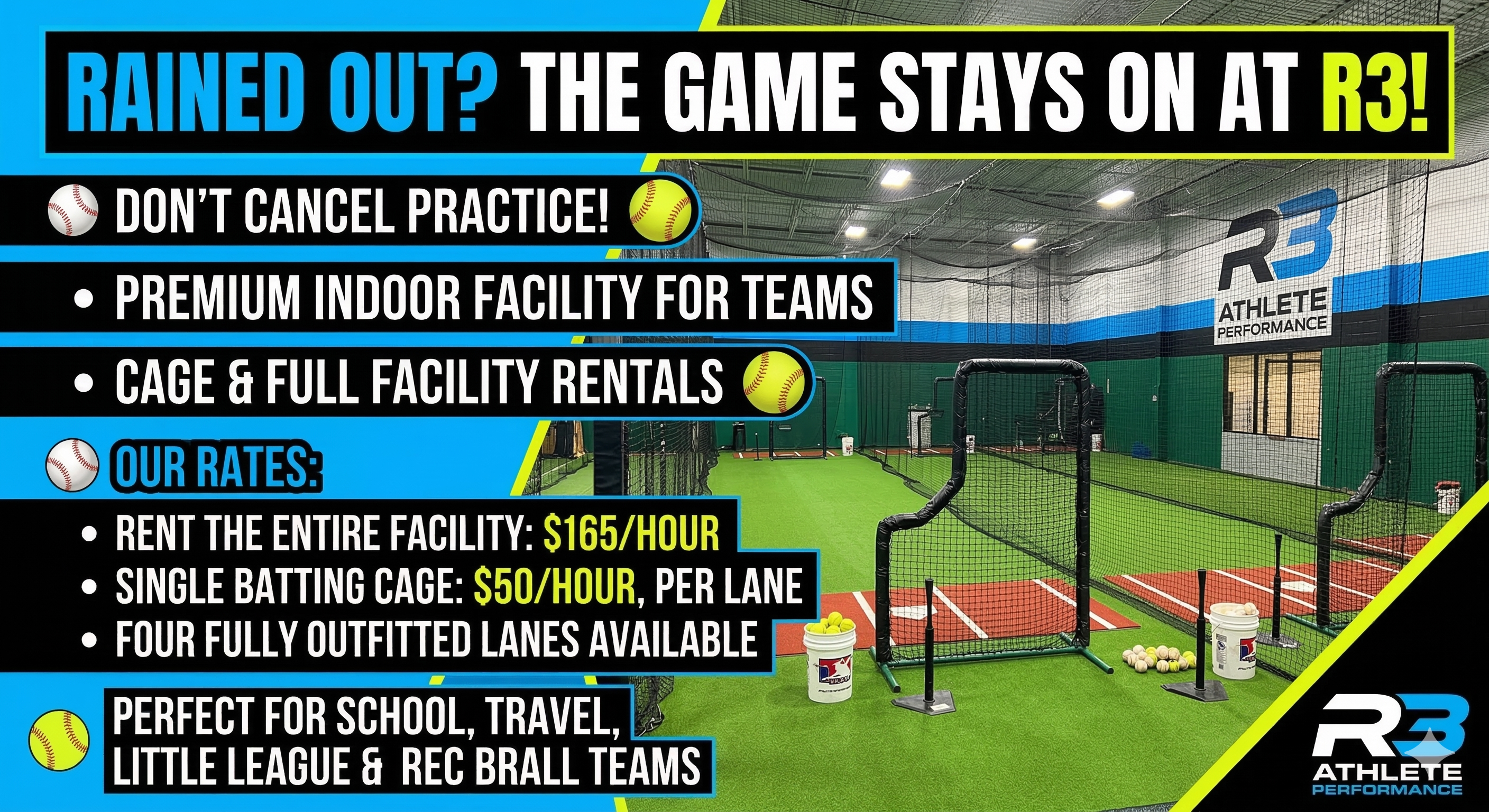 But at R3 Athlete Performance, the game never stops. Whether you’re coaching a school team, a competitive travel squad, or a local Little League or Rec Ball group, our premium indoor facility is your secret weapon against the elements.