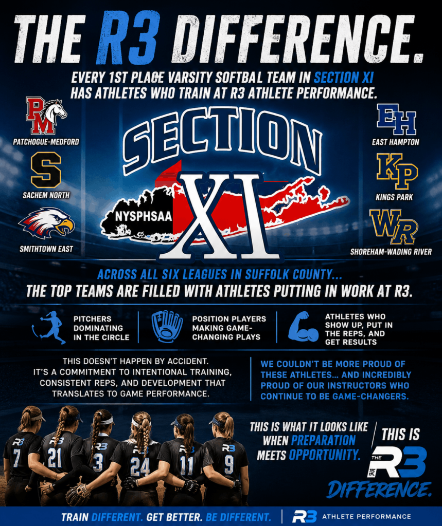 This season, every first-place varsity softball team in Section XI (Suffolk County, NY) has athletes who train at R3 Athlete Performance.